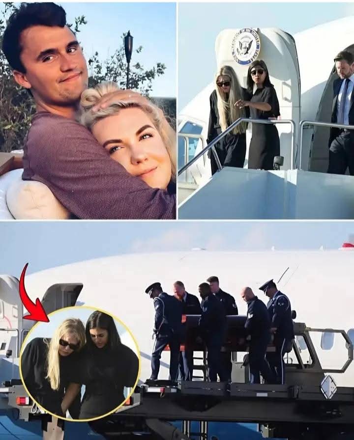 CELEBRITY“Her body gave out before her voice did” — Erika Kirk faints on Air Force Two as Charlie Kirk’s coffin arrives in Arizona. Carried away by aides, the 36-year-old widow left mourners shaken and divided: was it just grief, or a sign of the unbearable pressure now resting on her shoulders? The silence on the tarmac, the sirens, and the cameras rolling made the moment impossible to ignore,She rose slowly — fragile, grieving, yet unrelenting — and with surgical calm, placed her words in the heart of a chapel crowded with cameras. What began as a farewell instantly turned into a cultural reckoning — and the entire country leaned closer. But she had no idea: the moment wasn’t just about loss. It was about what the silence had concealed. Every tribute, every carefully rehearsed line from polished figures in dark suits, cracked under her stare. The air tightened. The crowd froze. The entire ceremony became a courtroom. this was one of the most unforgettable public reckonings of 2025. So what exactly did she mean? And why did one glance make the entire room question what they had just heard?…….